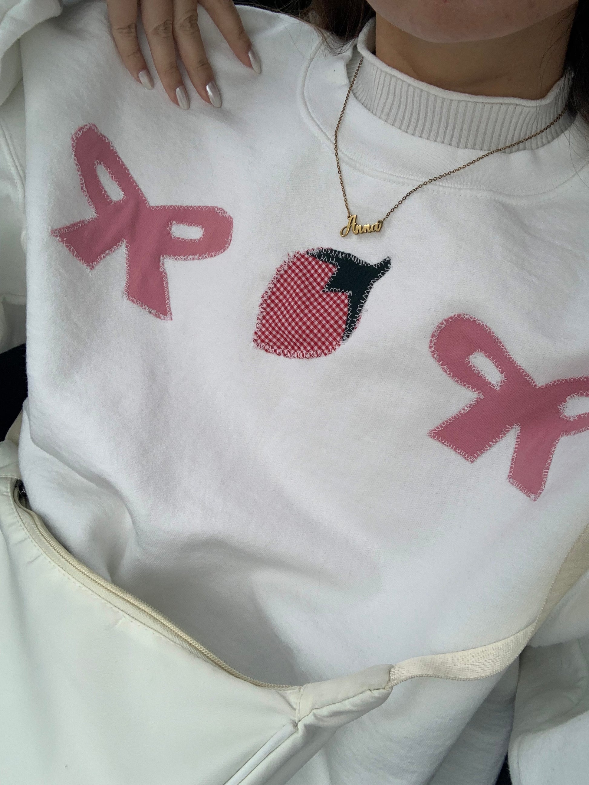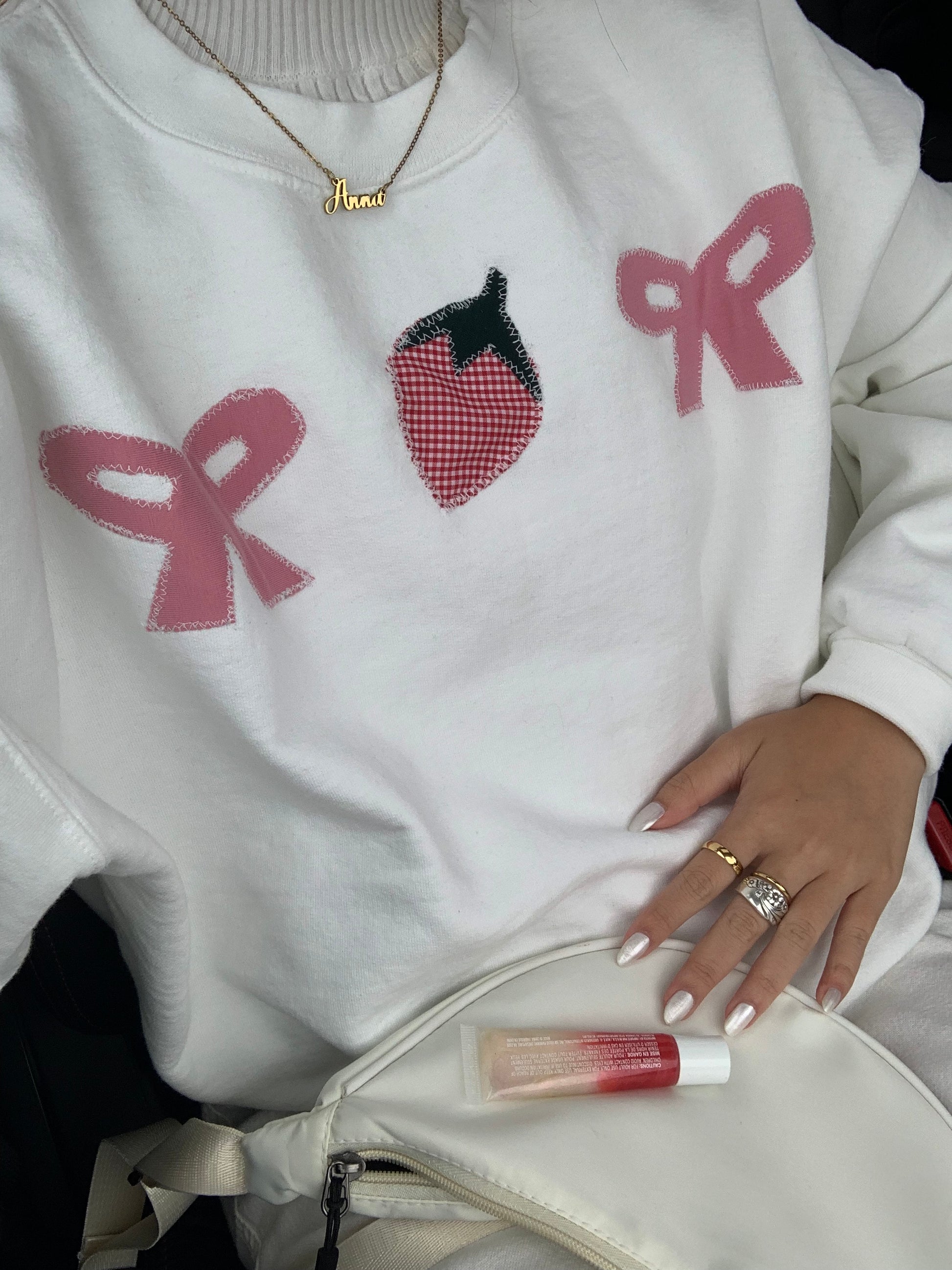 Sweatshirt with stitched red gingham strawberry and pink bows.