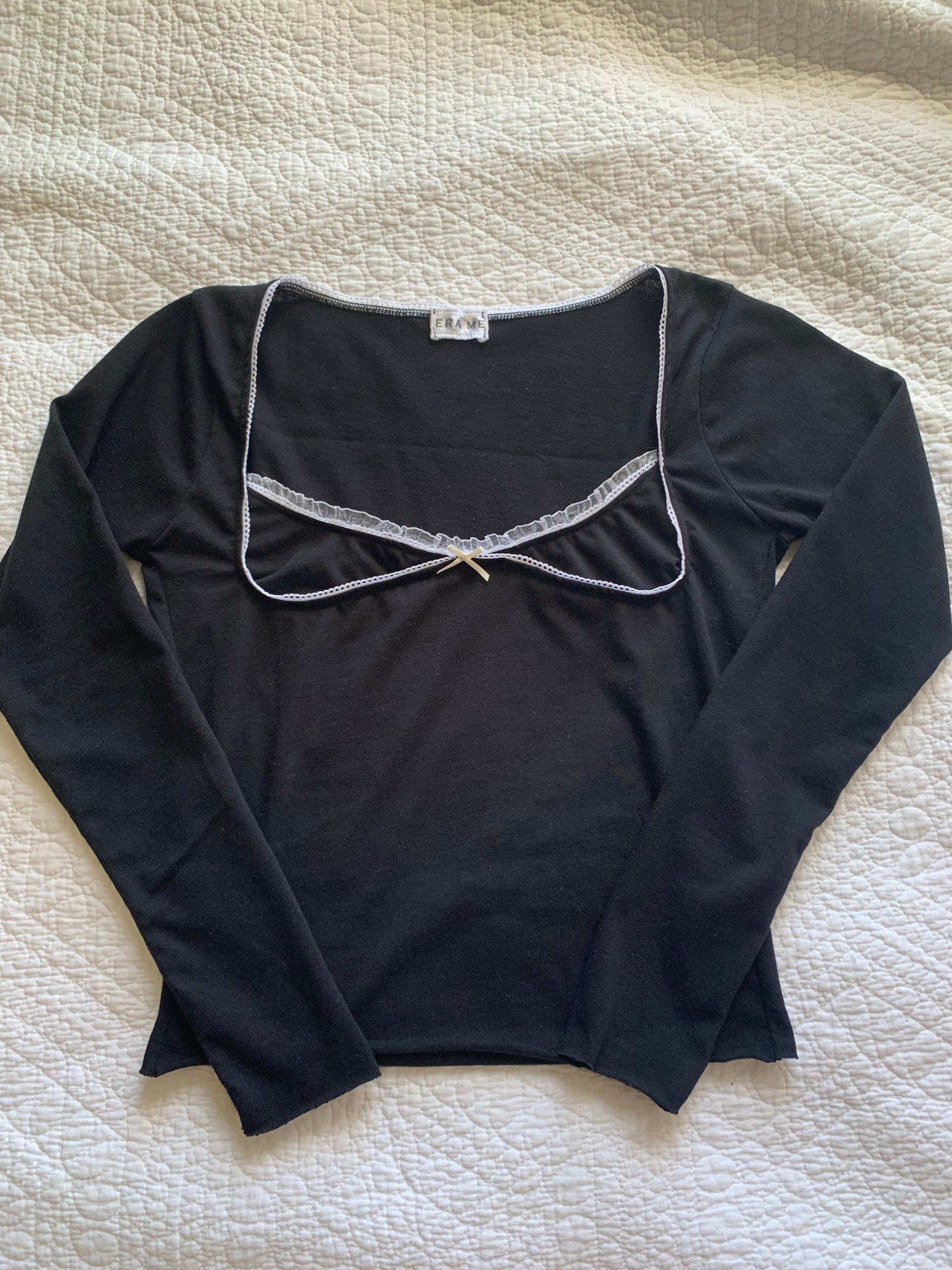 Ultra flattering open neck long sleeve top made from a soft and stretch cotton material. Features white trims with a dainty bow.