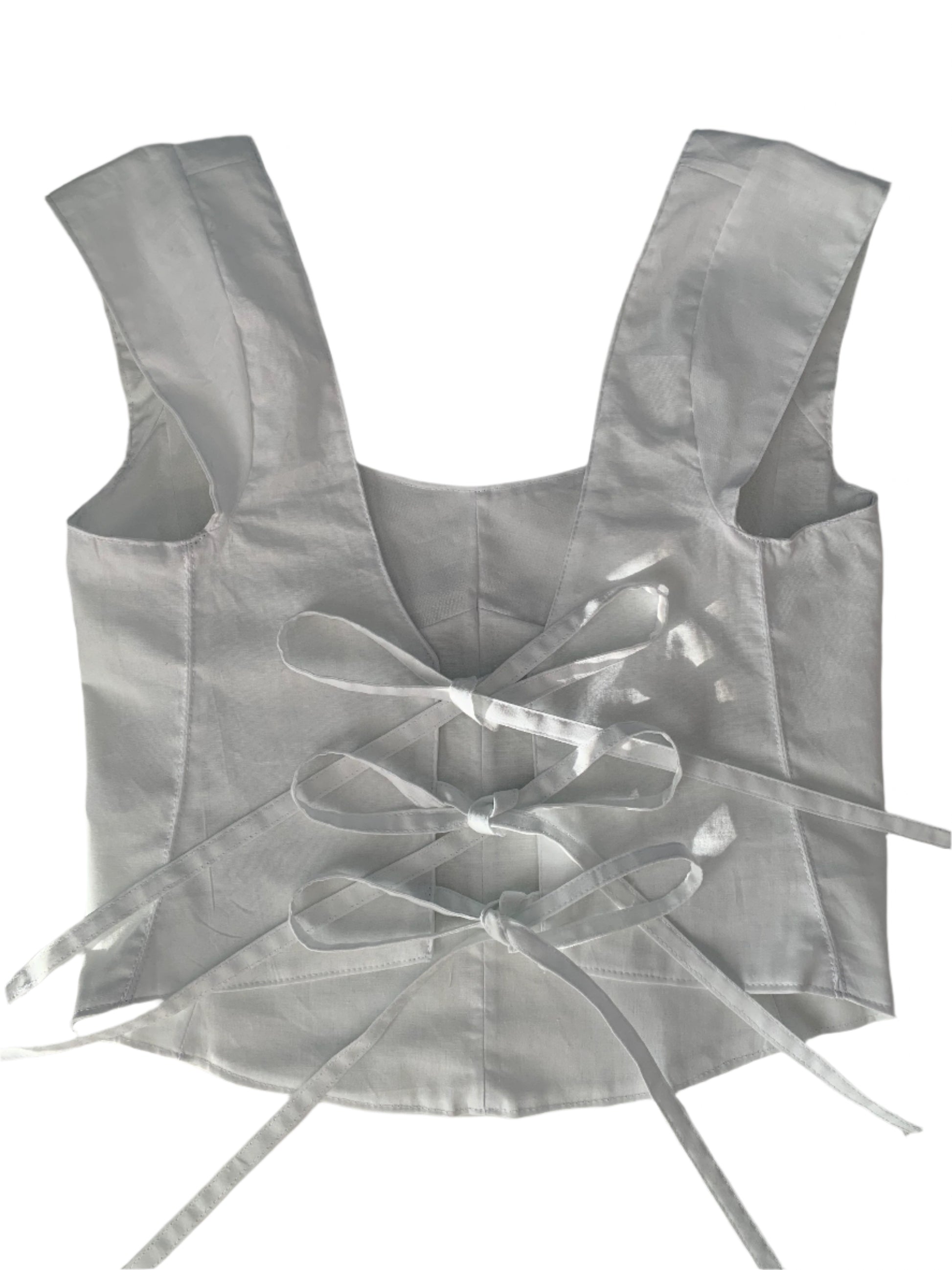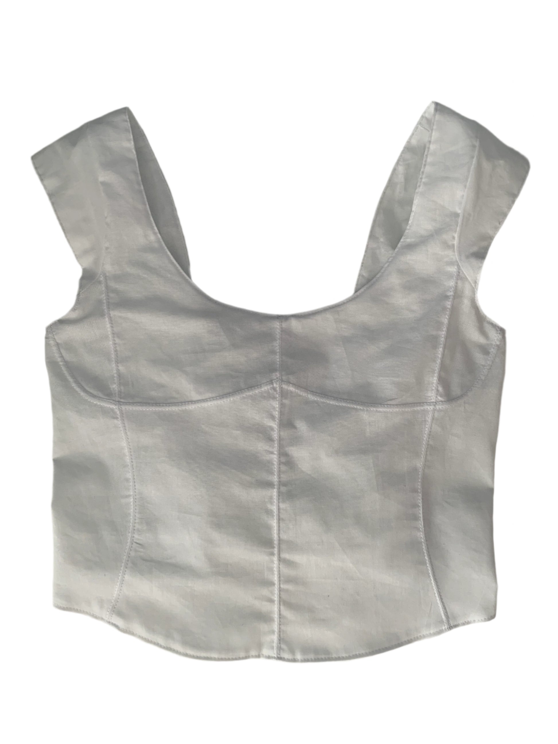 White double lined corset style fitted top with back ties. Features cap sleeves, adjustable ties, and a mid-length bodice.