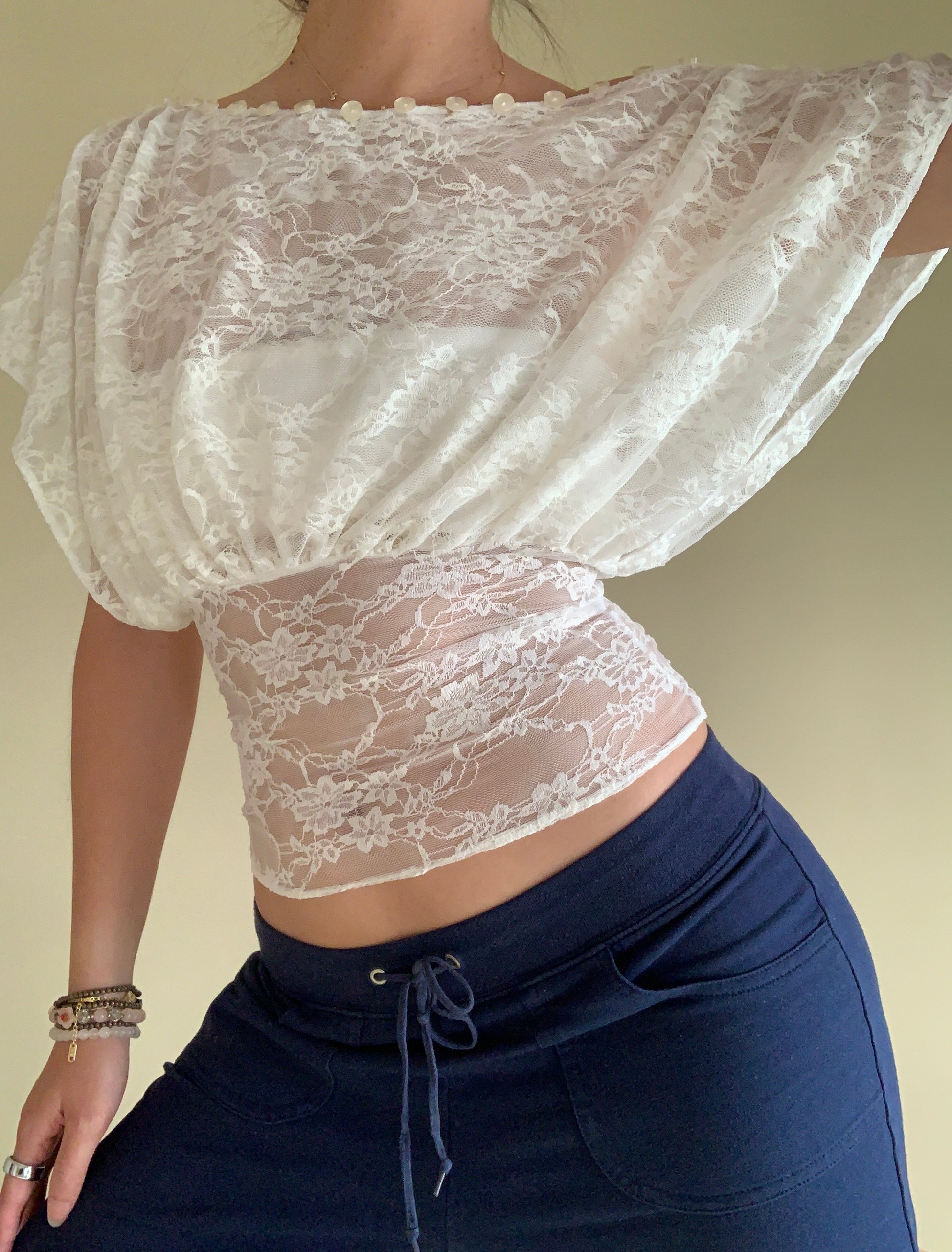 Multifunctional full length button drape top meant to be worn multiple ways. Designed with a double lined lace top, bust gathers and a fitted waist. Does not come with bandeau (as shown in photo)