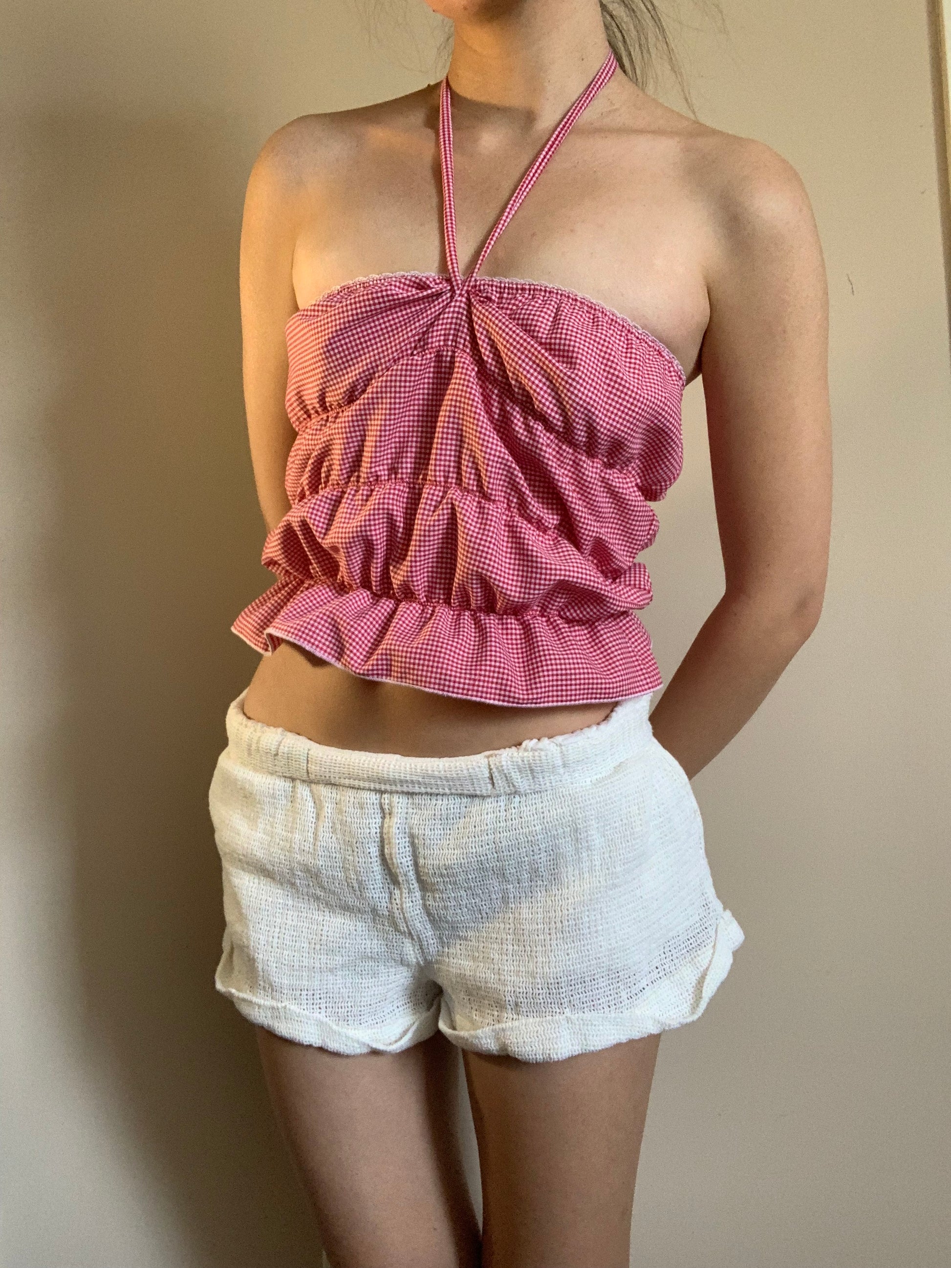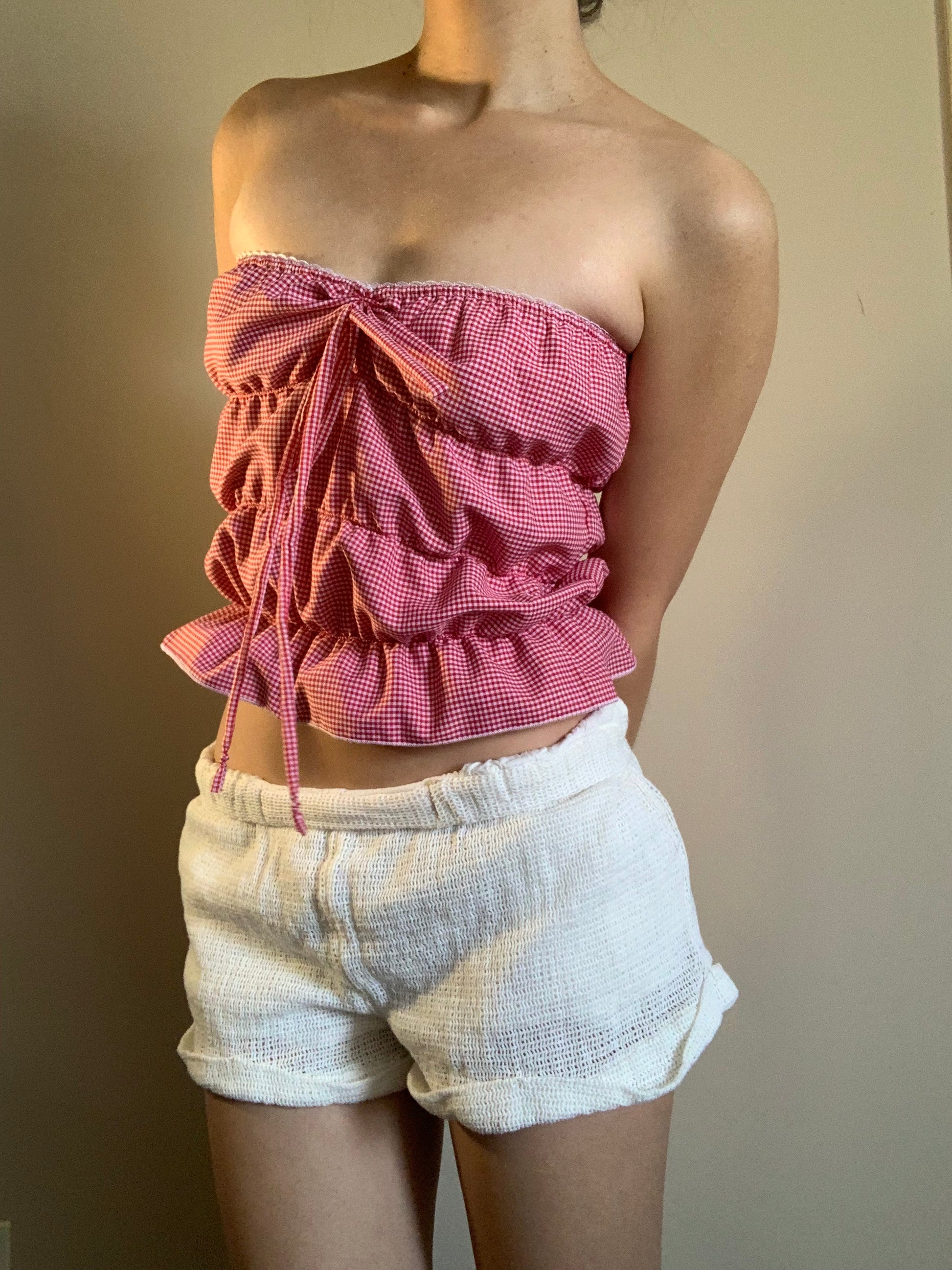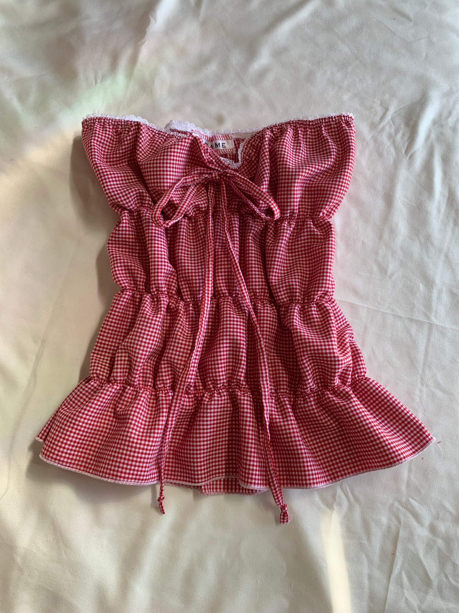 Cherry red gingham full length puff tube top featuring dainty white lace and a sluggish bow.
