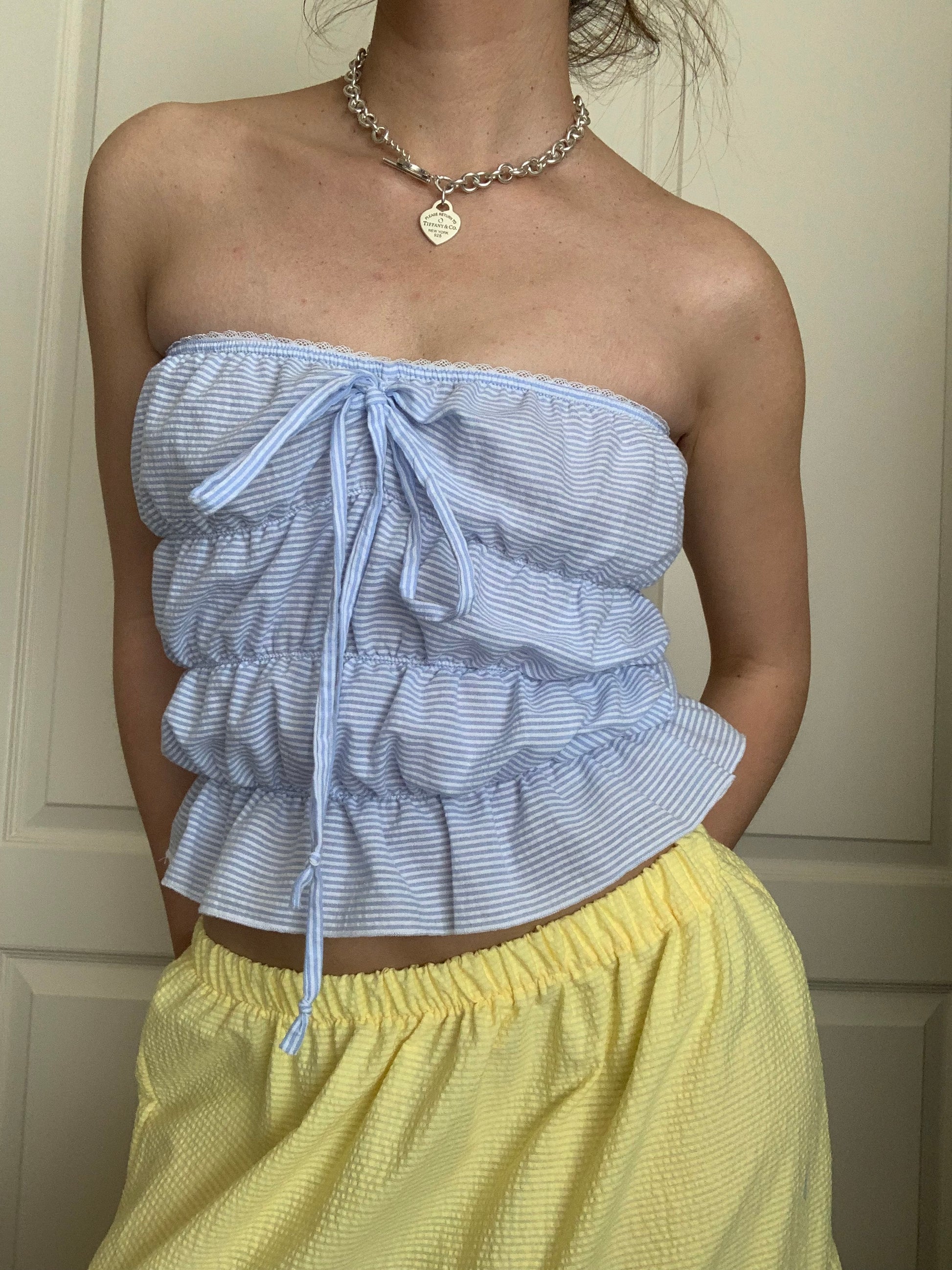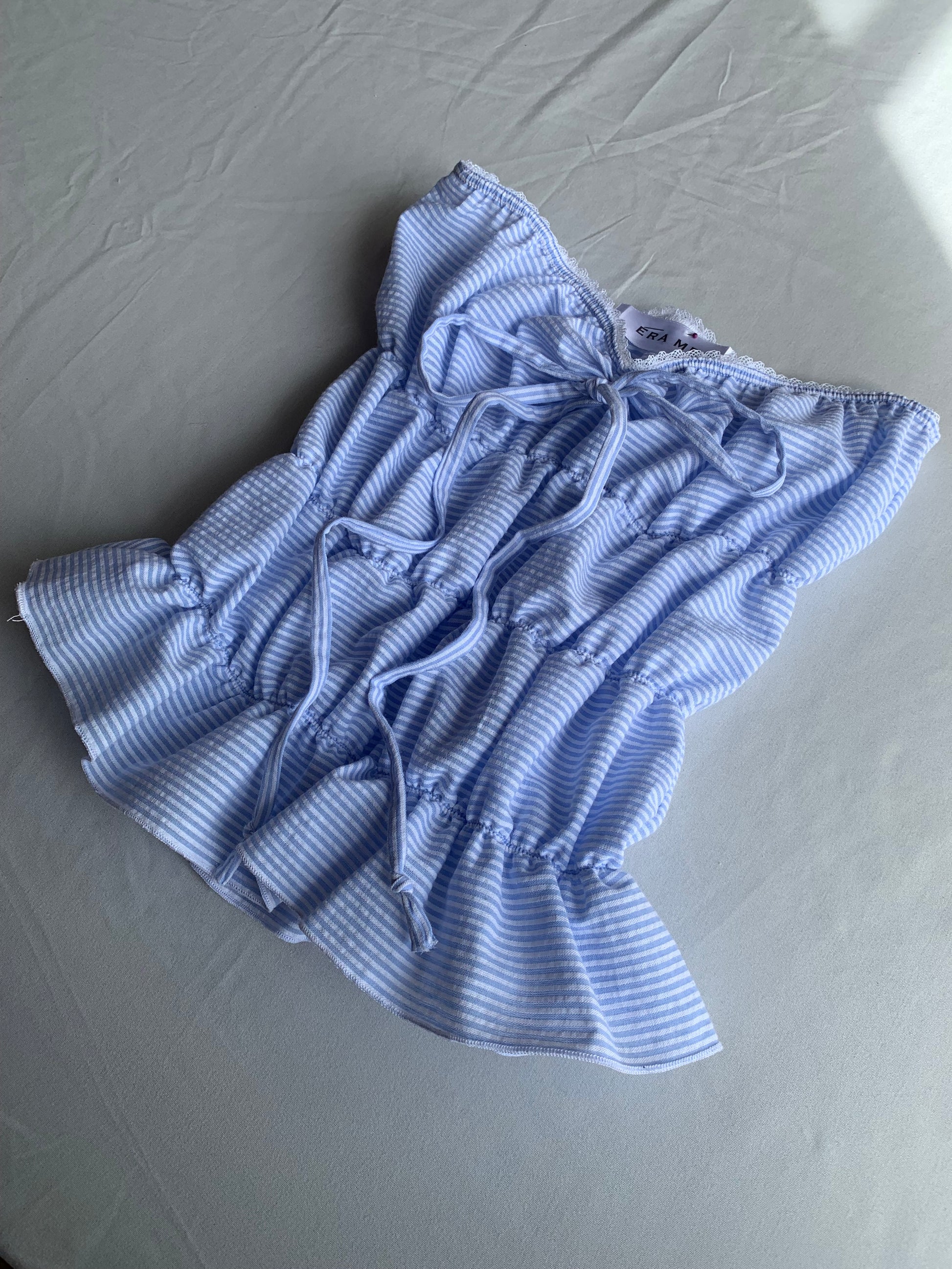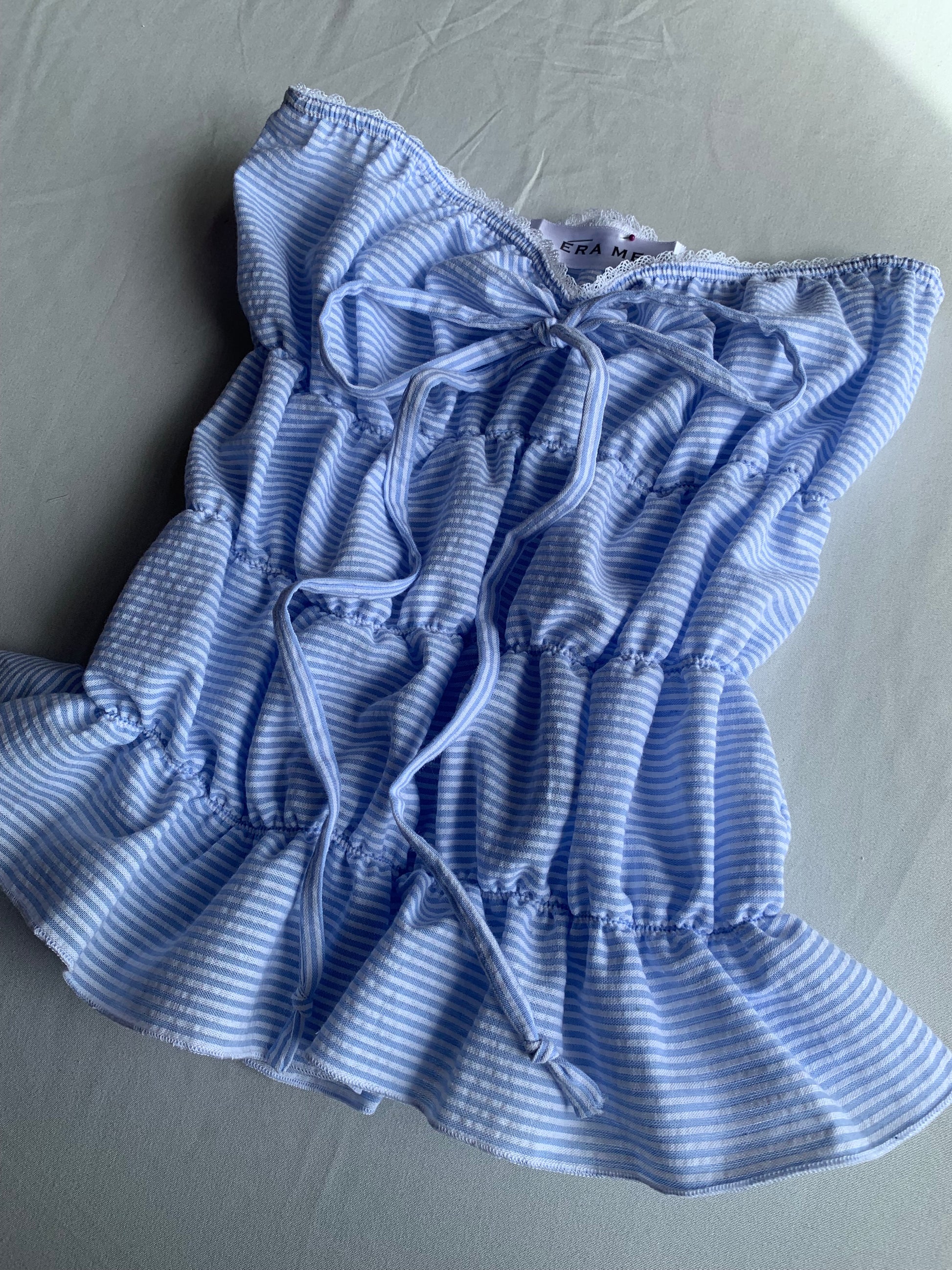 Blue sea stripe full length puff tube top featuring dainty white lace and a sluggish bow.